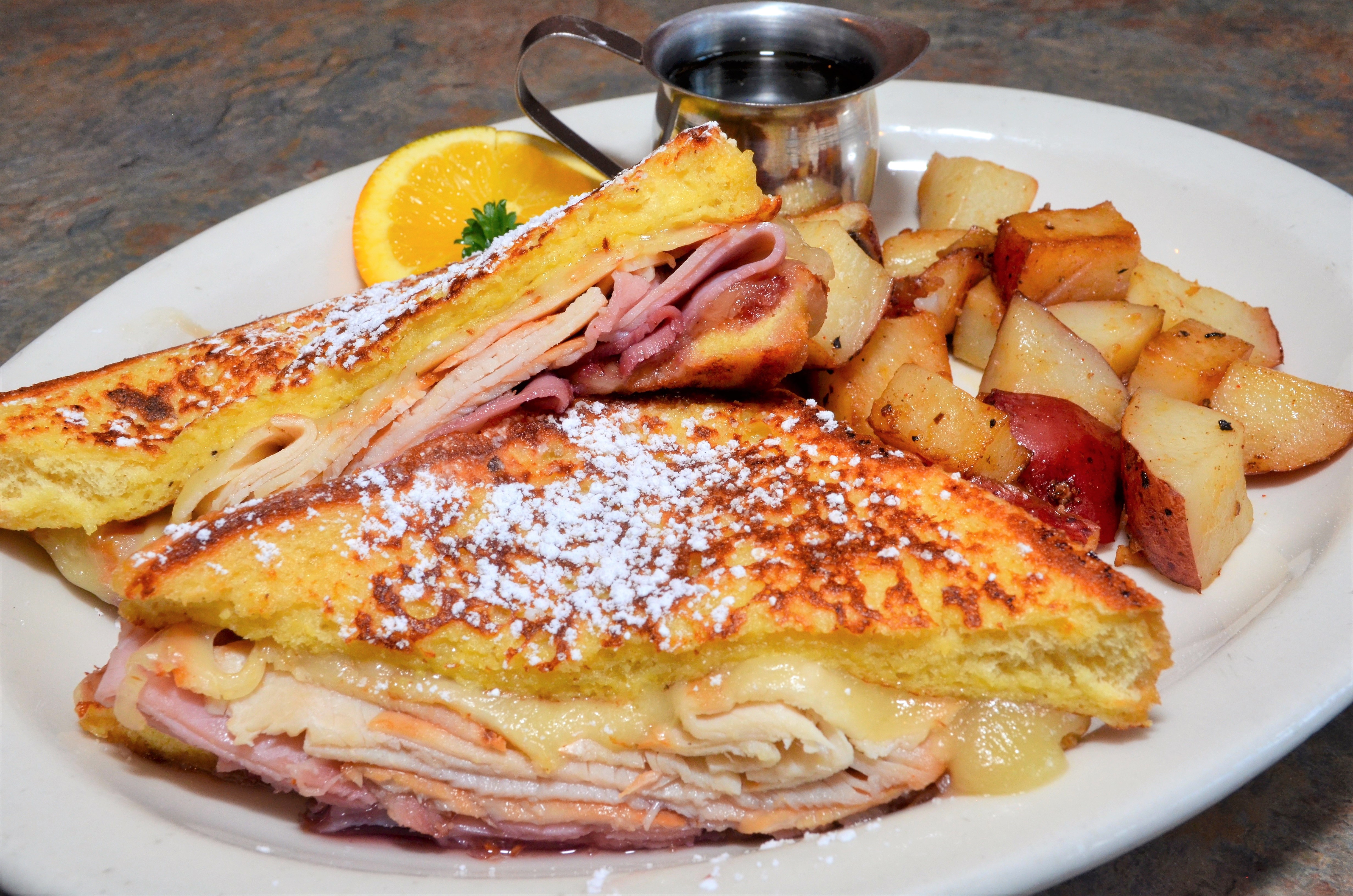 Thinly sliced ham, oven roasted turkey breast, and Swiss cheese grilled between two slices of Texas style French toast, served with syrup - VOTED BEST IN NH!! 11.99